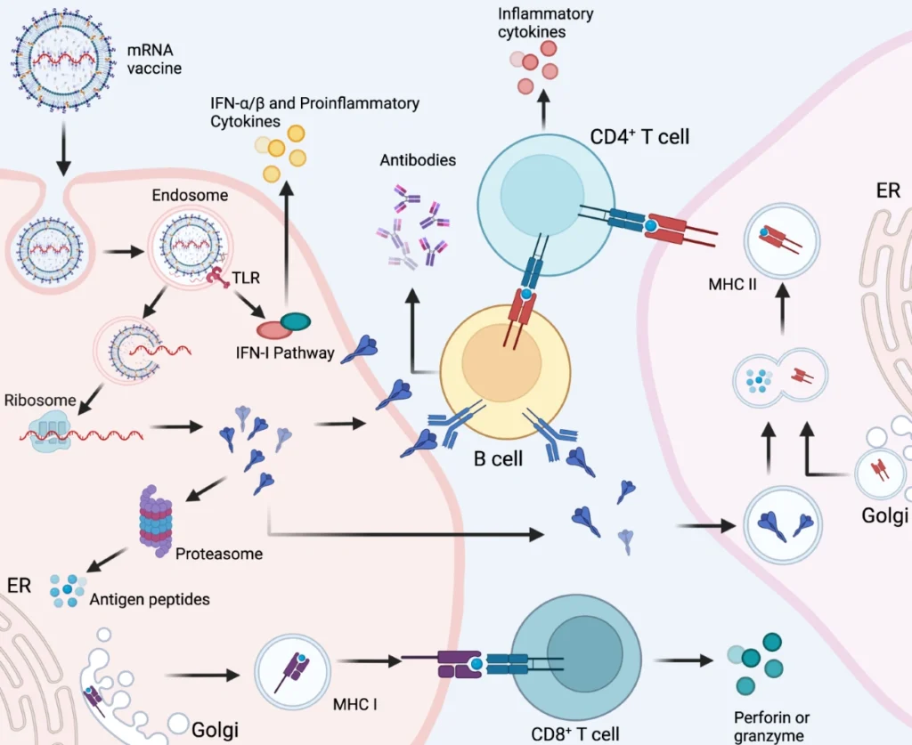 Di dalam sitoplasma, mRNA memicu sel untuk memproduksi protein lonjakan. Protein ini kemudian ditampilkan di permukaan sel, sehingga sistem kekebalan tubuh mengenalinya sebagai benda asing dan mulai memproduksi antibodi. Pada akhir proses, tubuh telah belajar cara melindungi diri dari infeksi di masa depan tanpa perlu terpapar virus sesungguhnya.