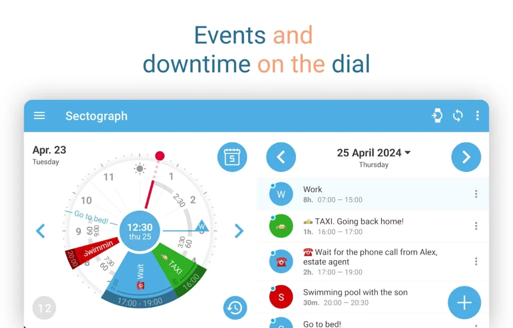 Sectograph mengubah cara kita melihat jadwal harian dengan memproyeksikan aktivitas ke wajah jam. Aplikasi ini secara otomatis mengambil semua acara dari Google Calendar (atau kalender lokal) dan menempatkannya pada tampilan jam yang dibagi menjadi sektor-sektor. Setiap tugas atau acara muncul sebagai sektor berwarna pada jam, dengan waktu mulai dan durasi yang jelas terlihat.