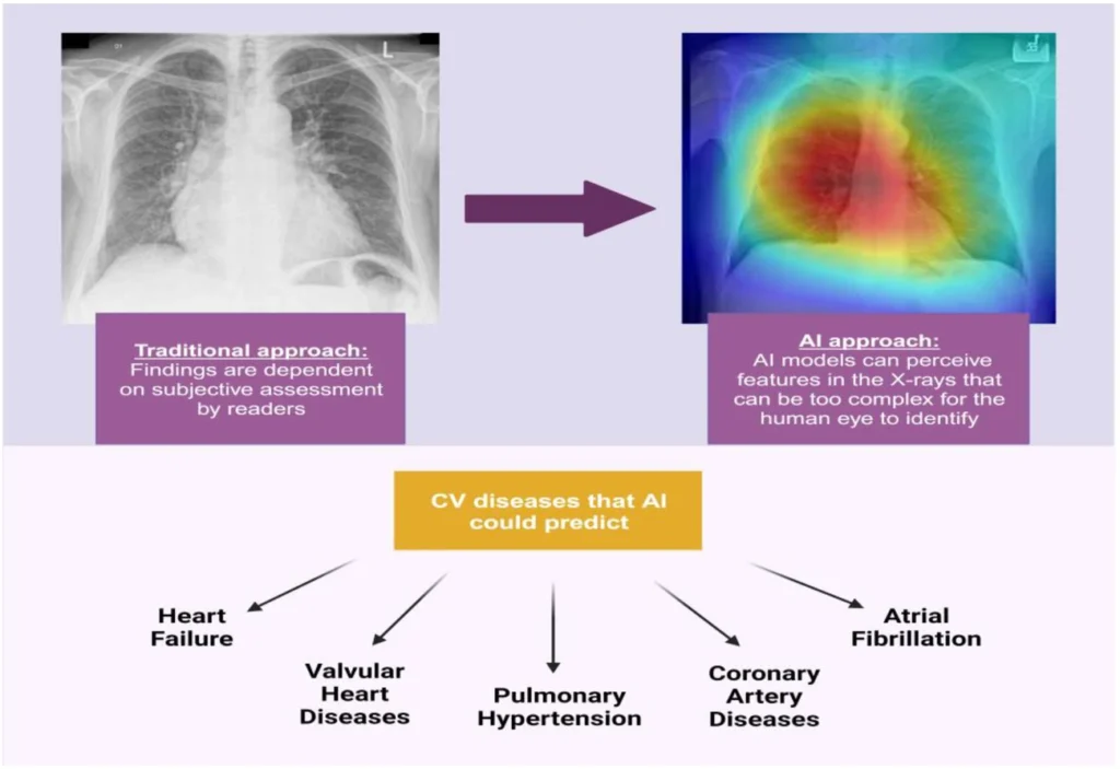Untuk penyakit jantung koroner, AI diintegrasikan dalam berbagai teknologi diagnostik. Salah satunya adalah stetoskop pintar berteknologi AI yang dapat mentransformasikan energi suara jantung menjadi data digital dan gambar real-time yang dapat dipindai melalui layar laptop atau HP. Teknologi ini meningkatkan keandalan dan akurasi diagnosis dibandingkan stetoskop konvensional.